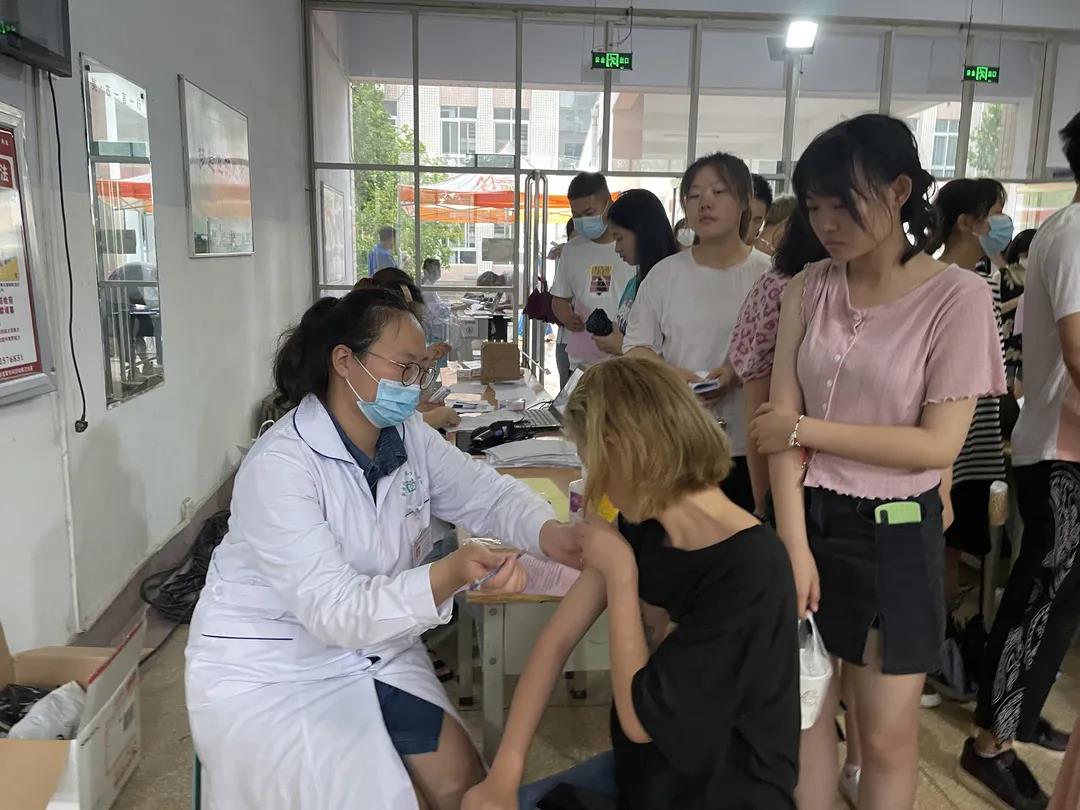 尽管天气湿热,正值雨季,在接到疫苗接种通知后,同学们在志愿者的带领下,仍旧守秩序,懂规则,知礼节,有序到教学区集合,并在志愿者的引导下按部就班进行第二次疫苗接种。